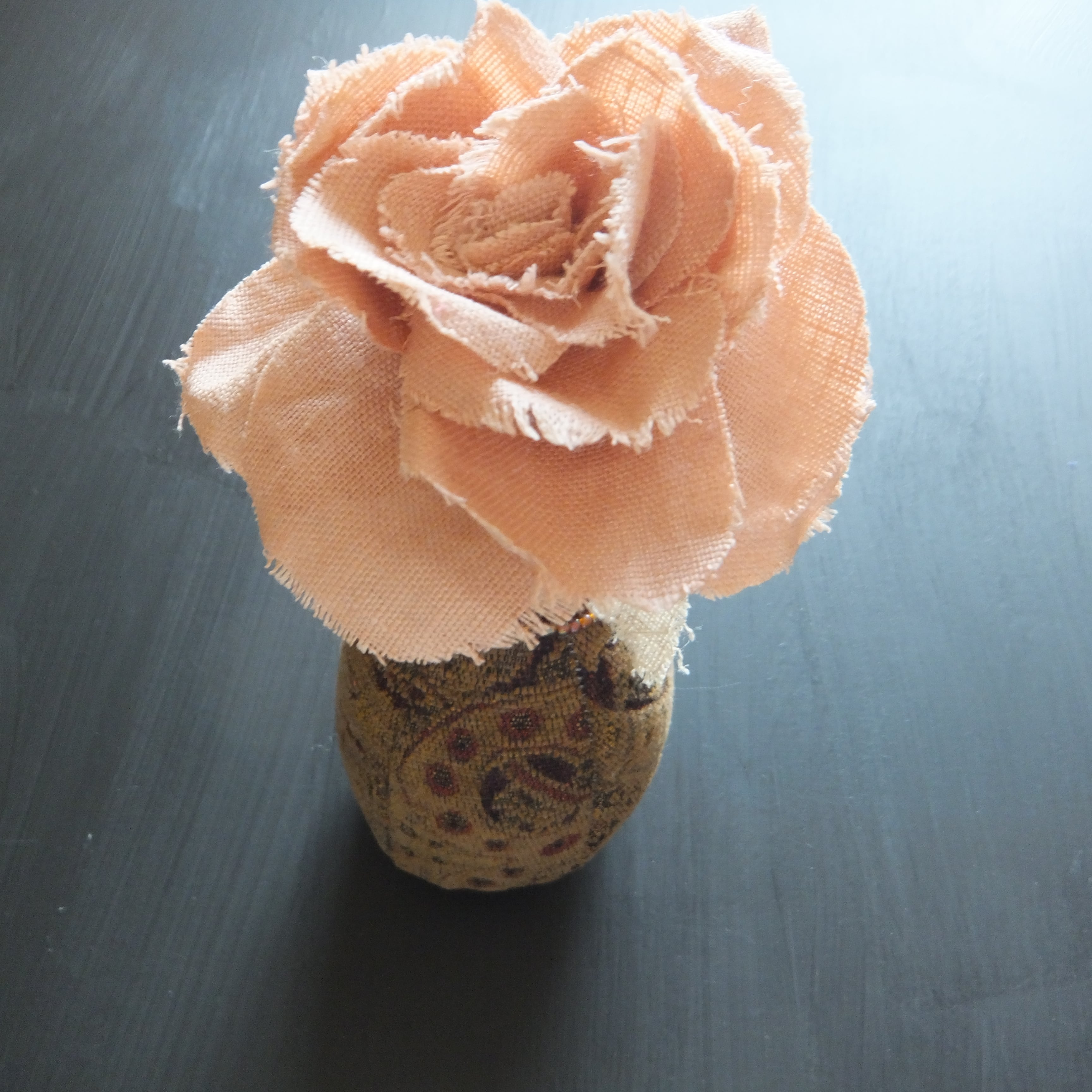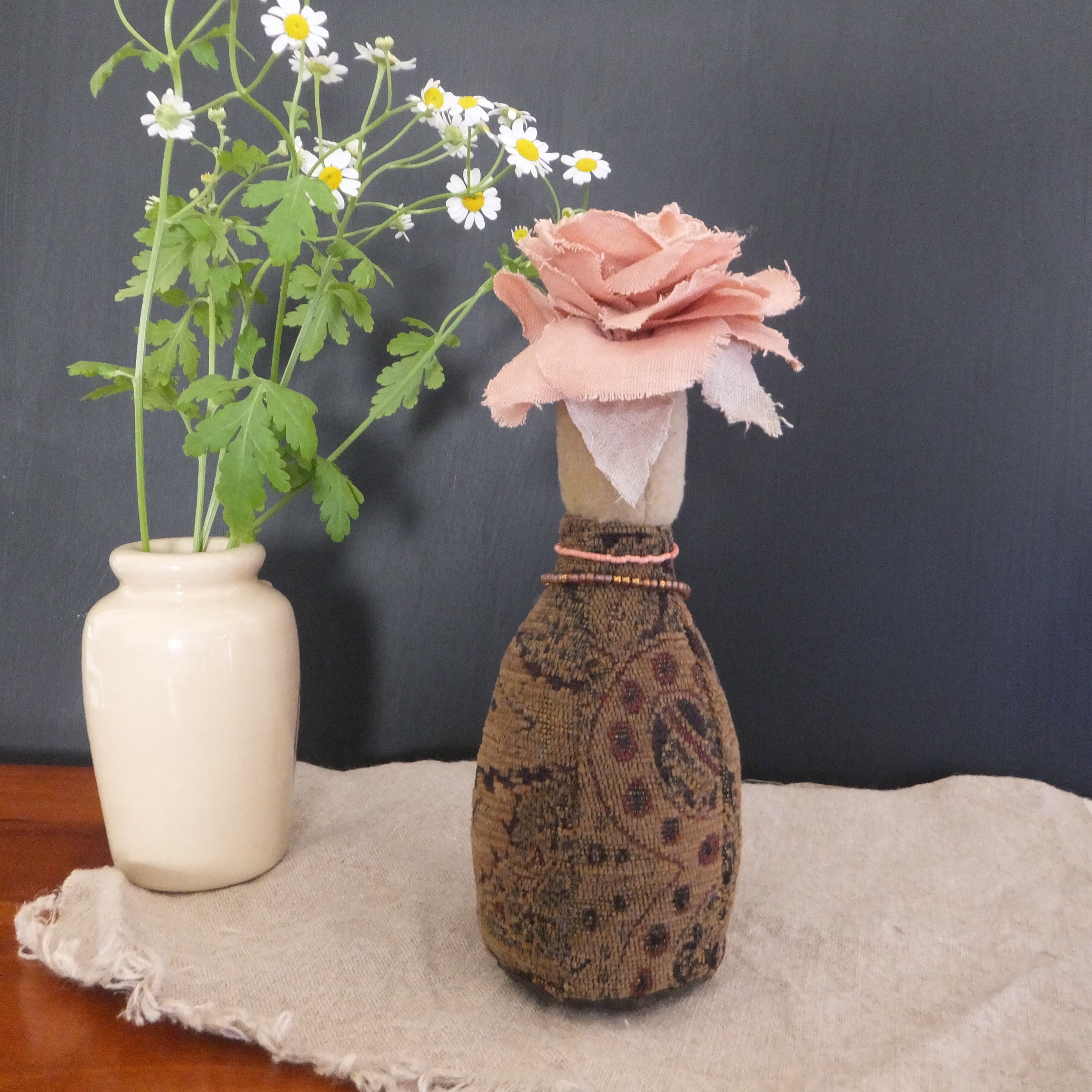 コサージュのような花と花瓶のお人形です。