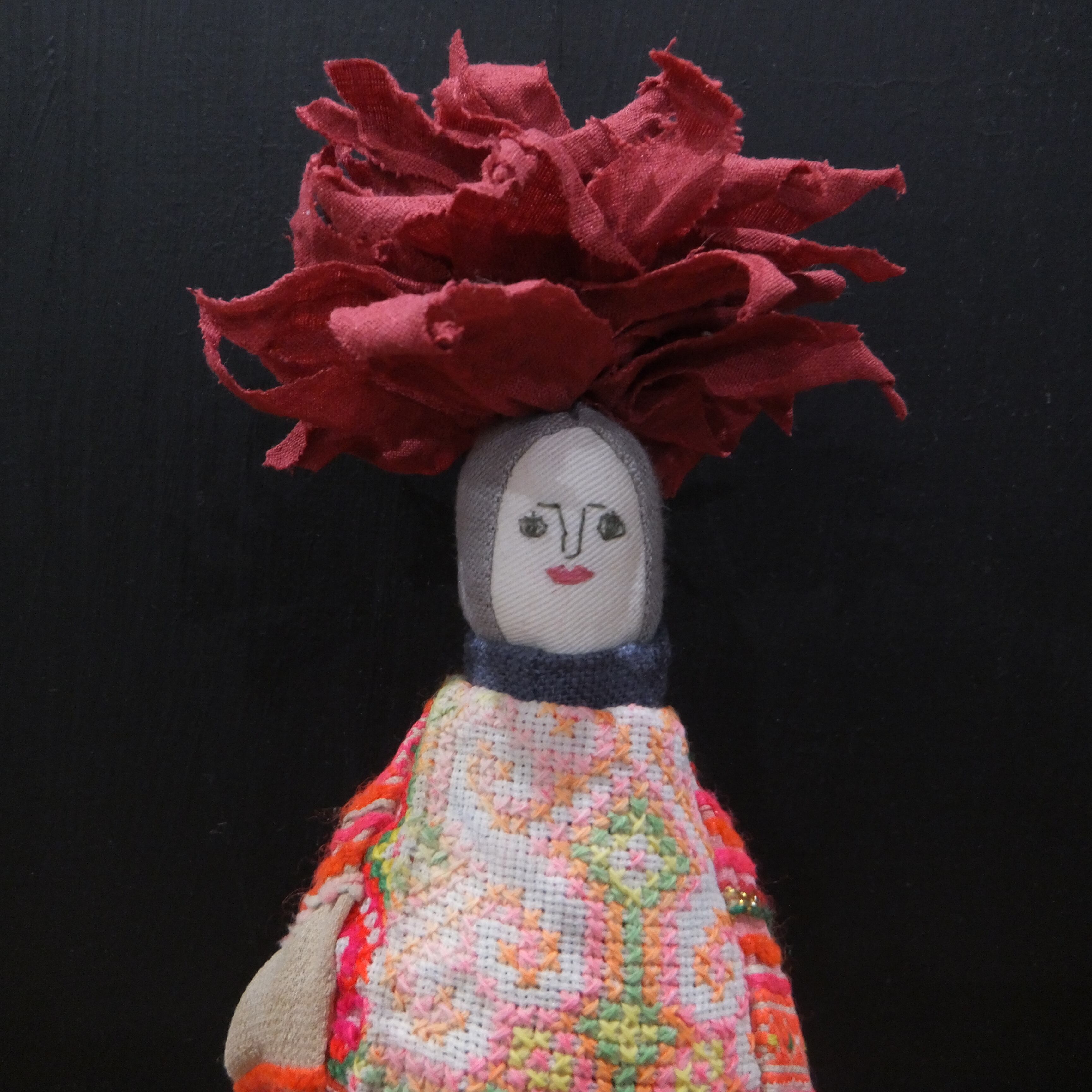 モン族の刺繍生地やカンタキルトを使った民族衣装のようなドールです。